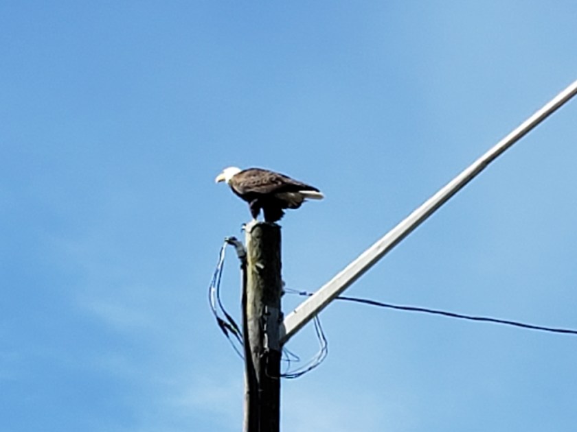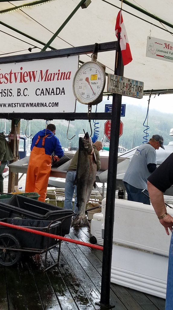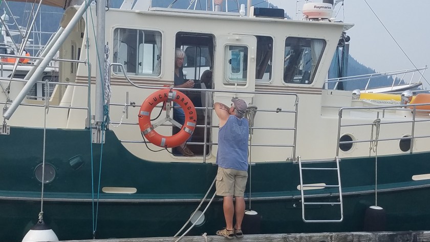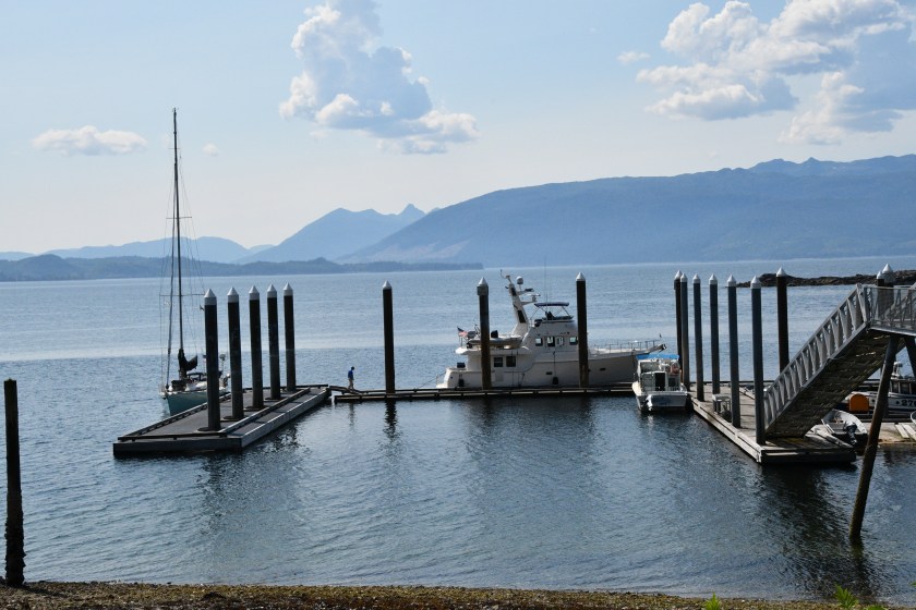 We continued on to Johnstone Strait. Johnstone Strait extends 54 miles and has a mean reputation for strong currents and choppy seas. And we experienced some choppy seas. We started the strait with 5 knot winds which picked up to 20 knots and some chop, so we ducked into Port Neville to anchor for the night. The following day the strait was “behaving nicely” so we cruised to Port McNeill enjoying sunshine and calm seas. Port McNeill is described as a small modern city with grocery stores, liquor store, auto parts, restaurants, banks and recycling! We were assigned a slip in the Port McNeill Municipal Harbour for a couple of days. We visited with Neil and Dianna on Plamor N50, cruisers we know in Anacortes Marina and the crews of Starina and Car’d Away.