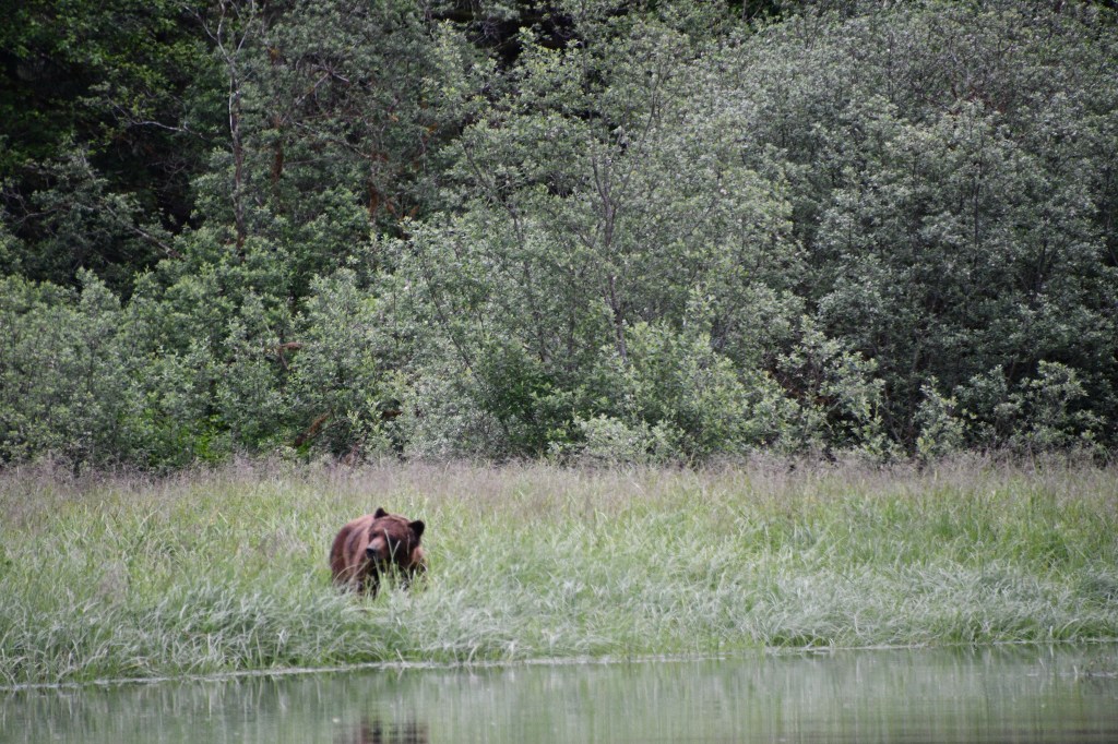 Our cruise up Grenville Channel, part of the main Inner Passage route leading north to Alaska was spectacular. The channel is very narrow at one point, only 0.2 miles wide. The channel is deep with steep mountainous sides. We encountered white sided porpoises swimming on the bow. For dinner we ate our fresh crab caught in Klutz Inlet!