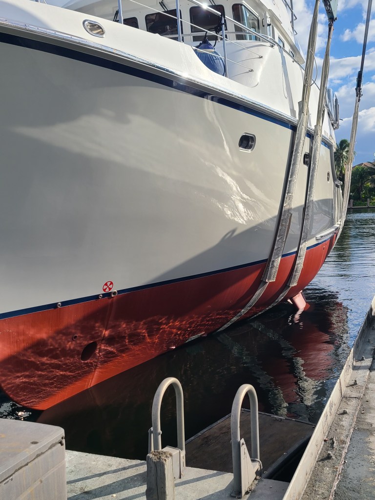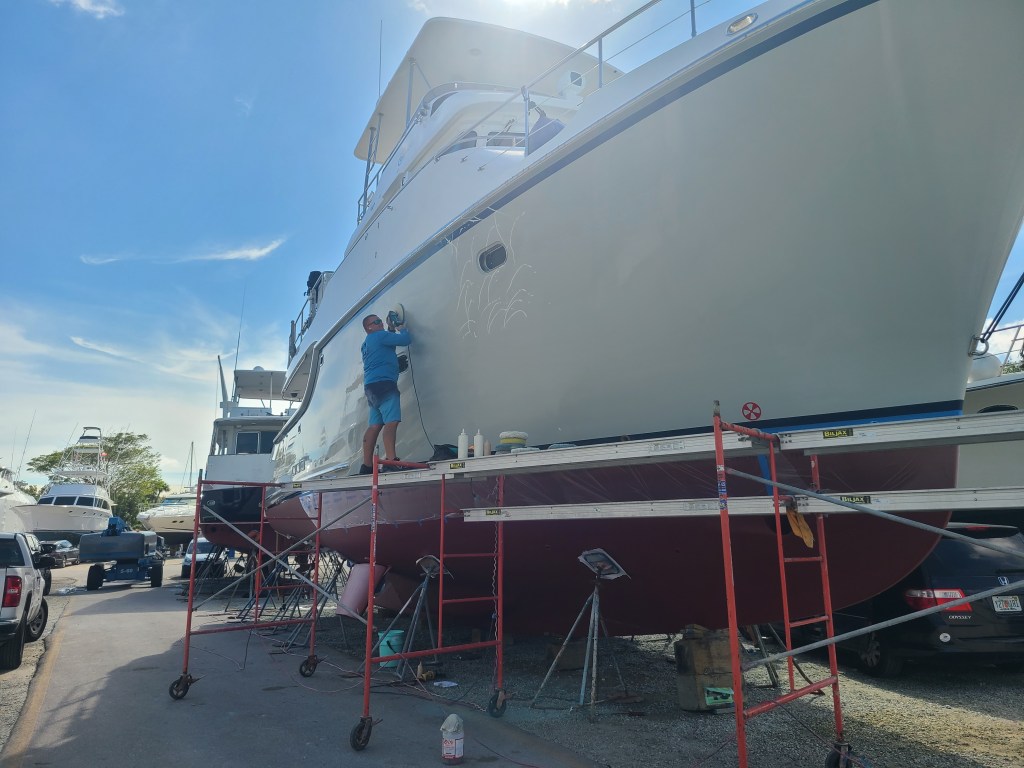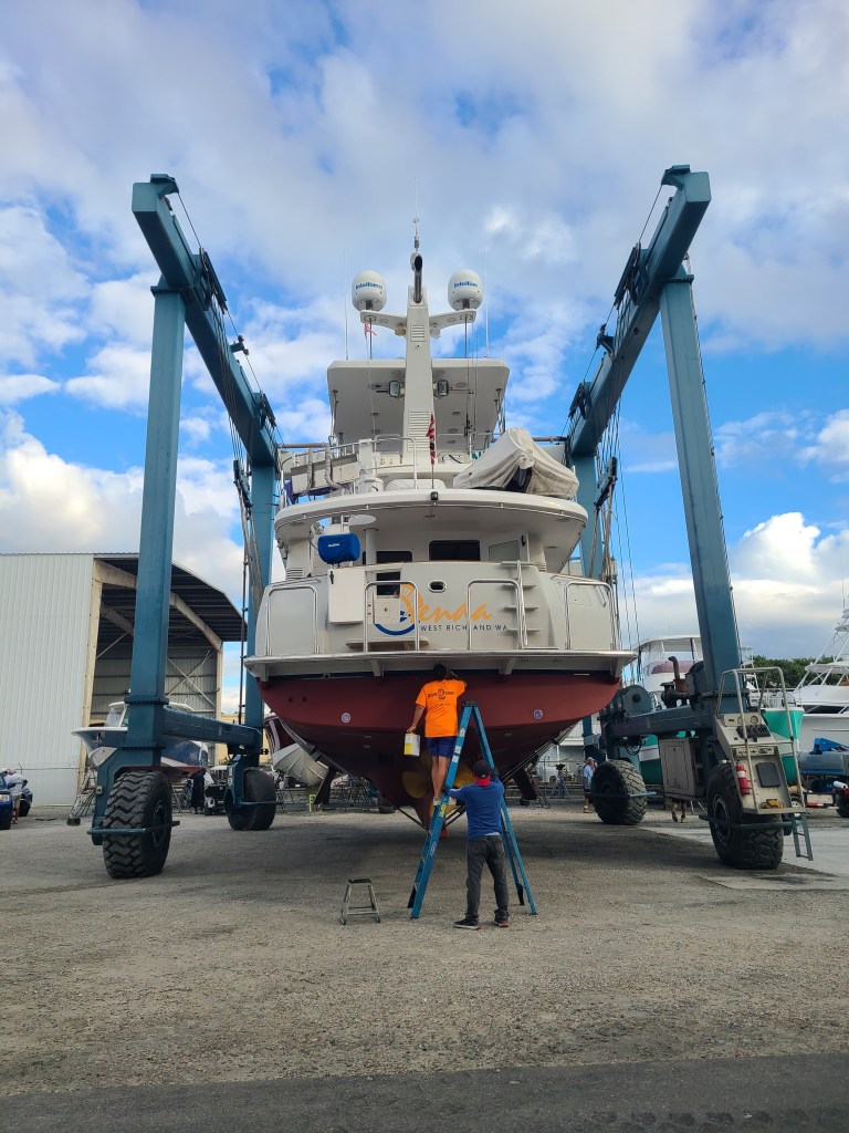 We quickly confirmed what our earlier research had indicated, that two months of transient moorage would not be easy to find and our only option appeared to be signing an annual moorage lease. This was not a good option for us as we are required to be out of Florida during the hurricane season. We had planned to do a bottom job on Orenda since it had been just shy of 2-years since the last one. Working with the good folks at Yacht Tech and Ocean Currents Marine, a plan was developed to achieve both of our objectives. We would haul Orenda and block her on the hard and do the bottom job and as much of the electronics refit as possible. We hauled out as scheduled and Yacht Tech managed our bottom job cleaning and new bottom paint while at the same time, we contracted for a hull detail by Coleman Marine which would be followed with the balance of boat detail once we were back in the water. Ocean Currents started the electronics refit at the same time so Orenda was a beehive of workers on the interior and exterior!