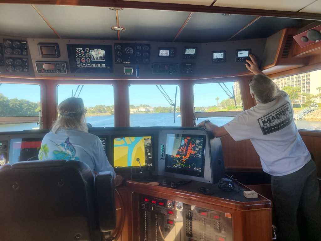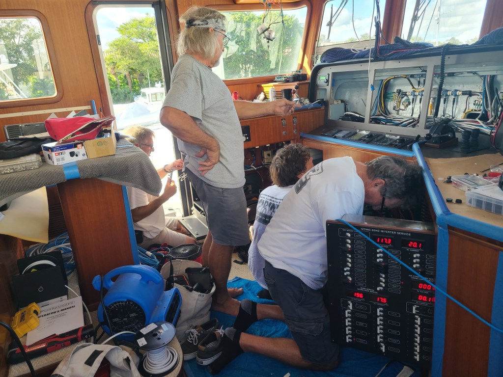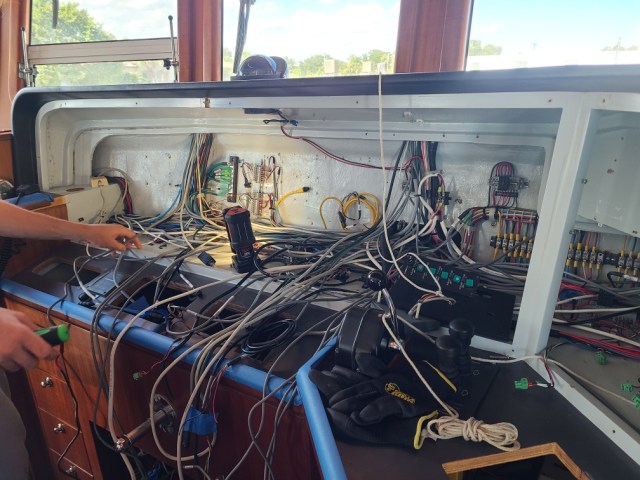 The electronics refit officially started on November 14. Ocean Currents Marine crew, Rob, Greg and Chase hauled tool bags, spools of wire, and boxes and boxes of electronics. Since we were on the hard in Seminole Marine, a DIY Boat Yard in Palm Beach Gardens, anything we brought on the boat or took off was via a 12-foot ladder tied off on the stern swim deck. Scott and I prepared the pilothouse by removing the old electronics, gauges, labeled wiring and connections, and covered the horizontal console and exposed wood edges with cardboard to protect it. And the process started! Hundreds of feet of wiring were removed. Headliners were taken down, electrical raceways opened, a few closets and cabinets were emptied to access above and below the spaces. The refit touched the entire boat from engine room to pilothouse to flybridge.