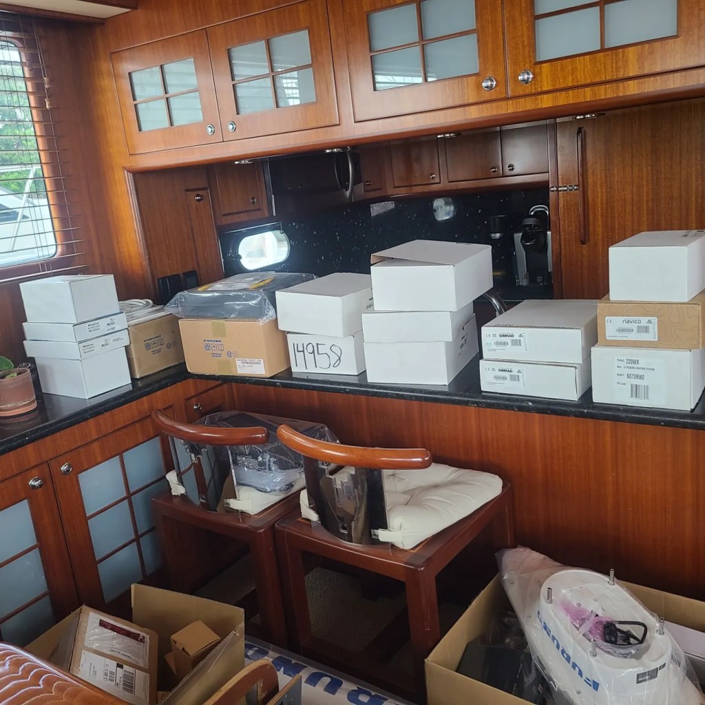 New instruments, gauges, radars were staged in the galley and salon until being installed.